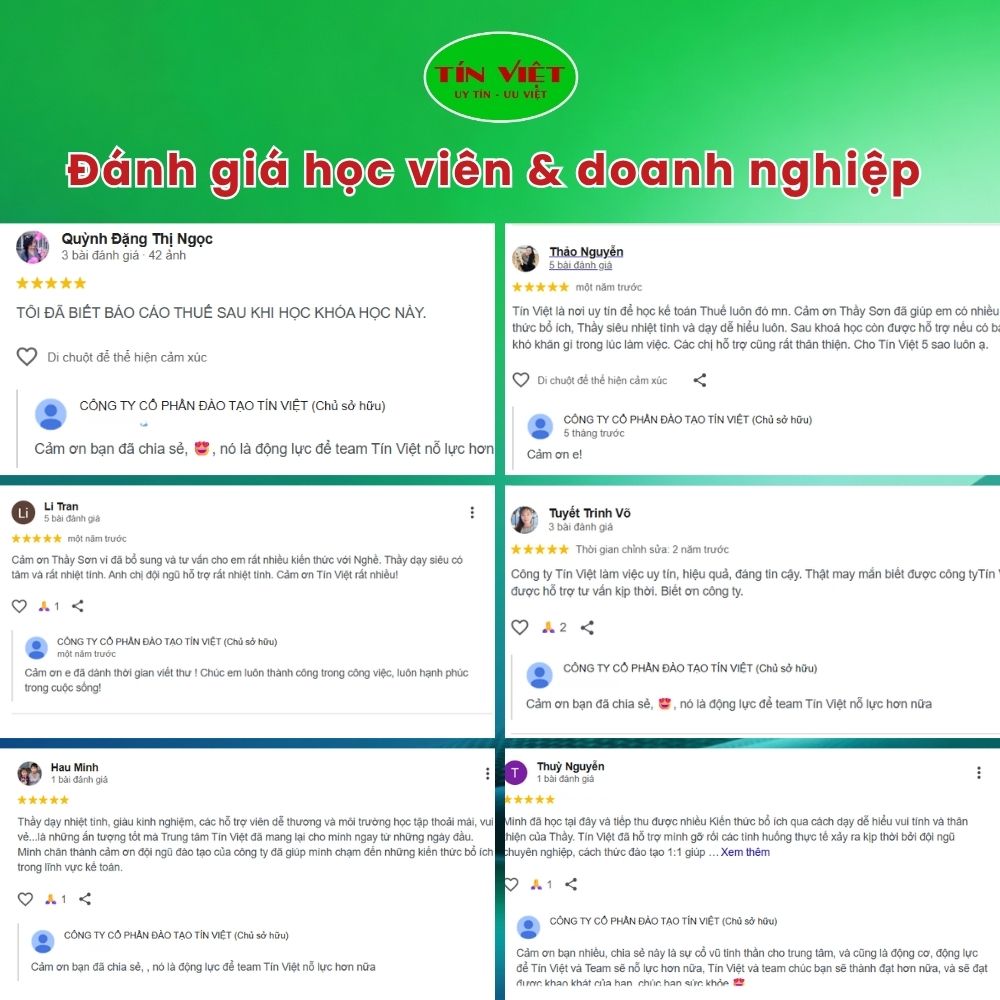 - Anh Quốc Nam – Chủ doanh nghiệp: "Với góc độ quản lý, khóa học giúp tôi hiểu rõ cách tối ưu chi phí thuế hợp pháp. Đây là kiến thức rất cần thiết để kiểm soát sức khỏe tài chính của công ty."
